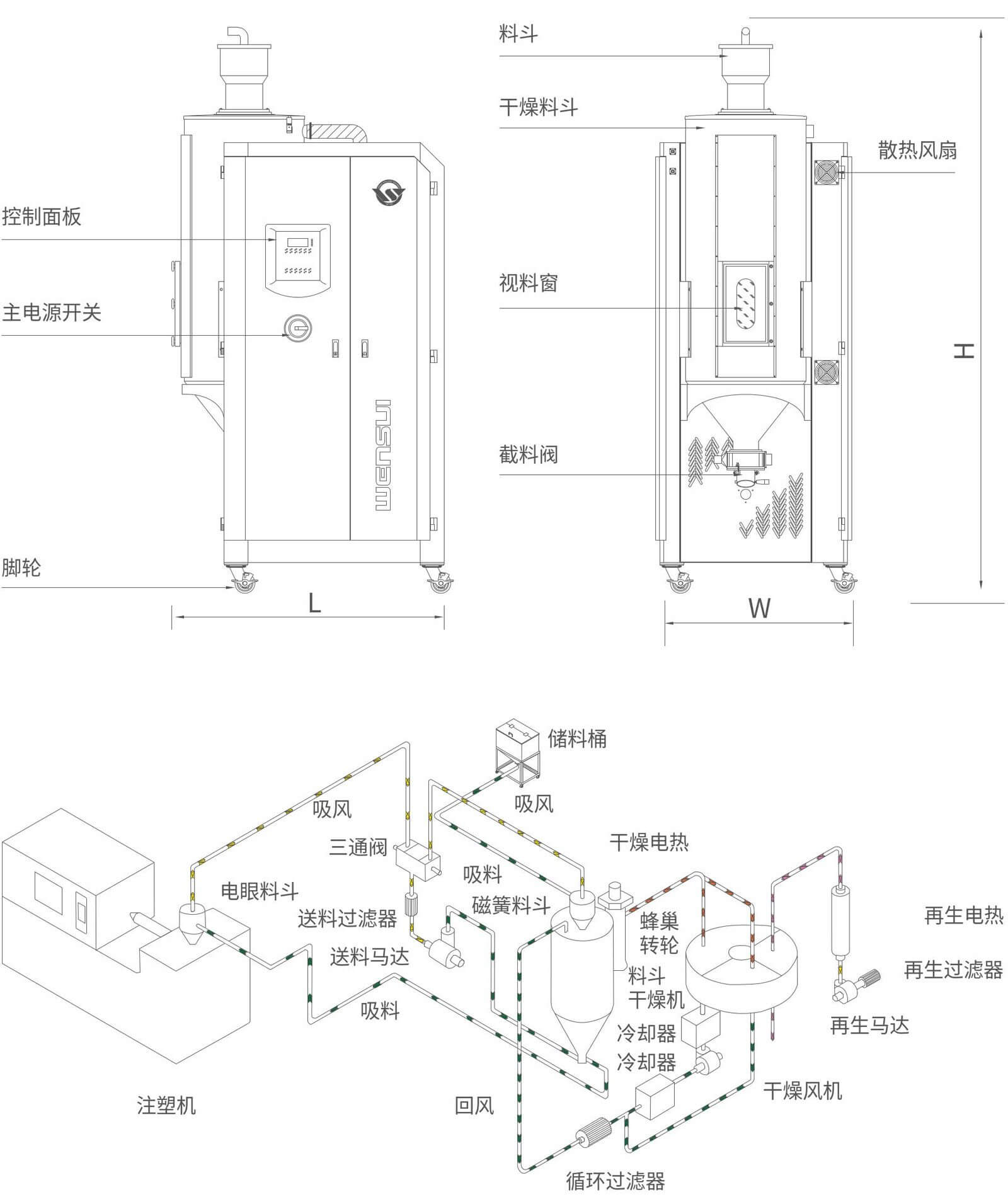 本机台集除湿、干燥、送料三种功能于一体。