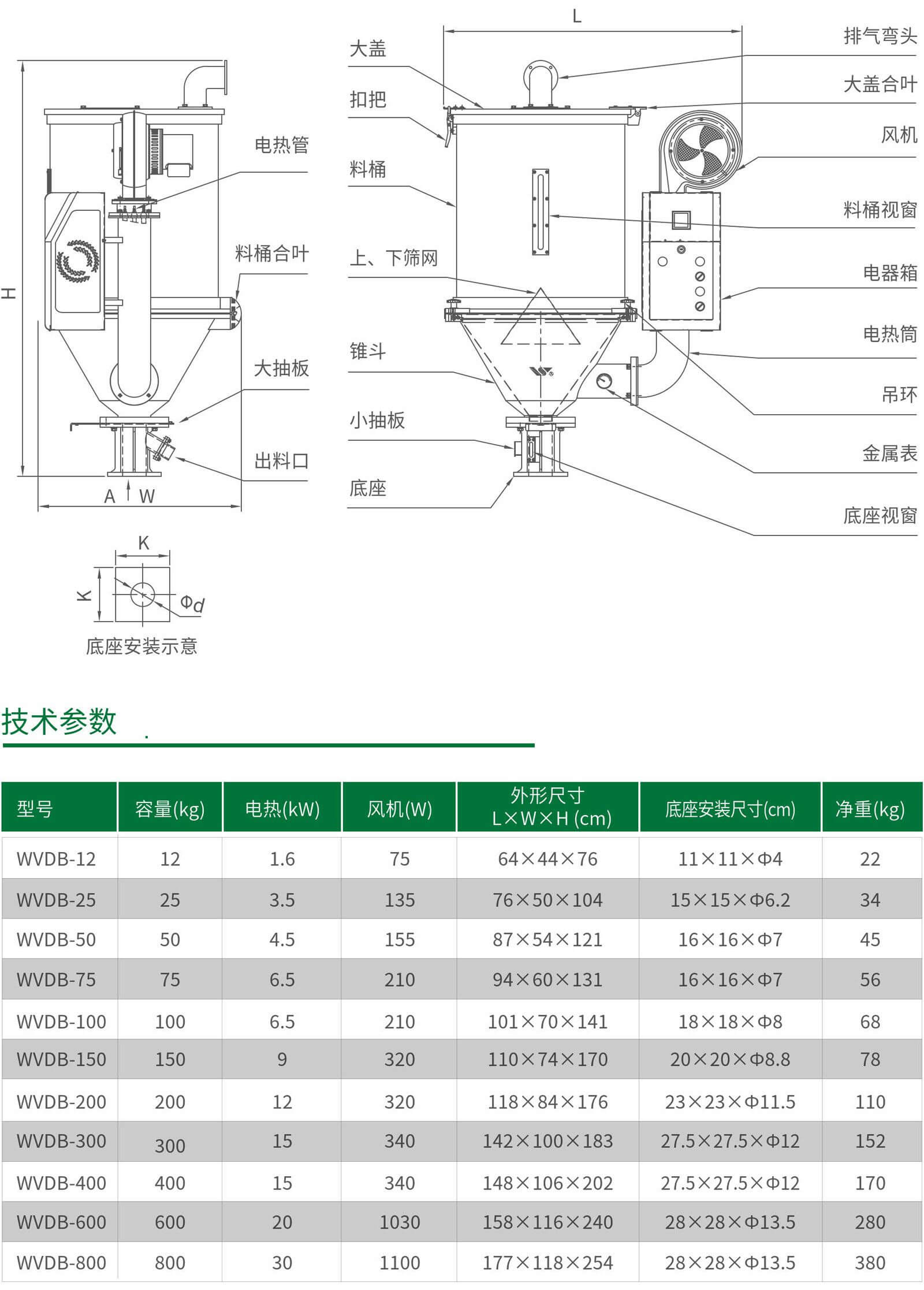 注:干燥机容量以装载尼龙6颗粒状原料的质量为标准;电源:3Φ 380VAC 50Hz