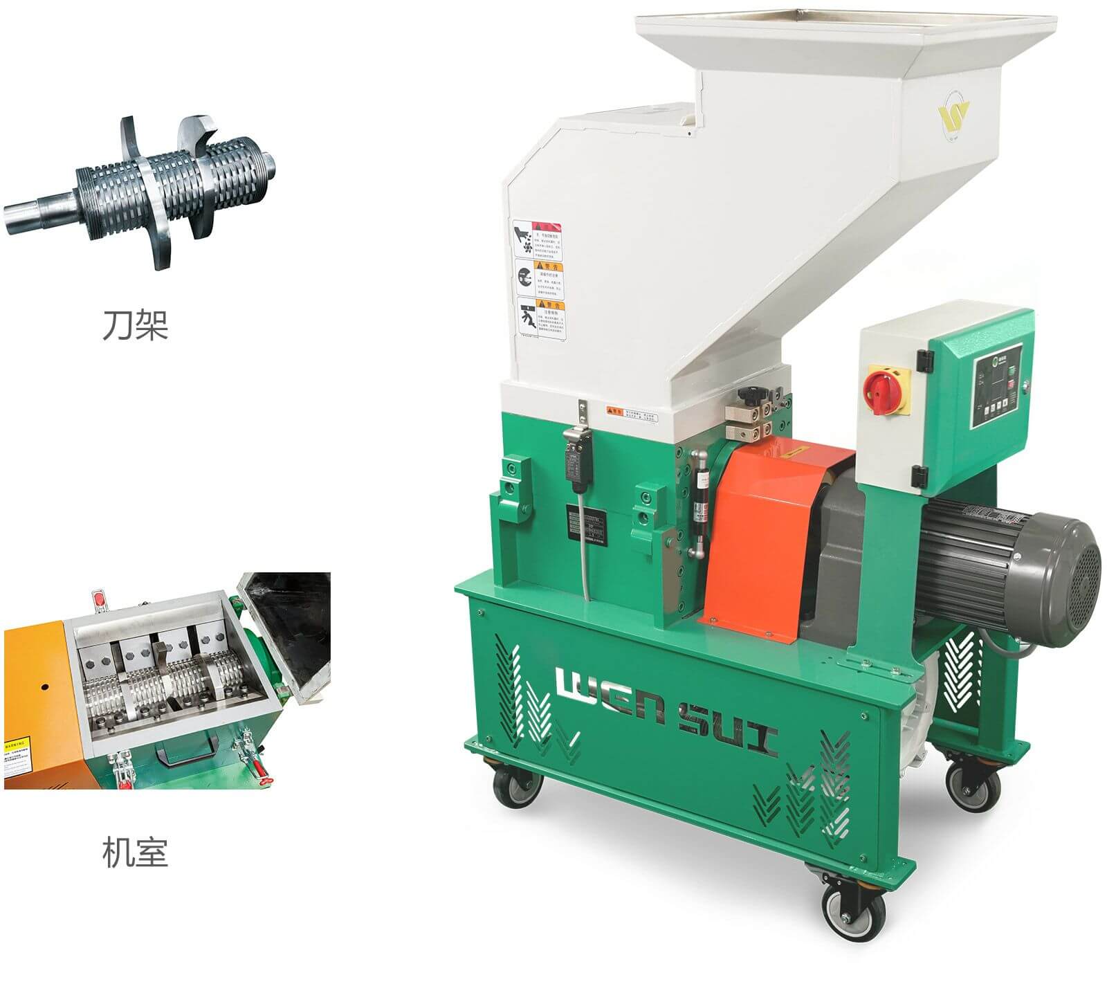 性能特点无筛网设计,颗粒均匀、粉末少、无粉尘污染。采用台湾齿轮减速机,扭矩大,质量优,寿命长。齿形圆柱动爪刀、爪形动刀一体设计,粗碎、细碎同步进行。齿轮减速机与主轴采用联轴器连接,破碎时运转平稳,噪音低。料斗、箱体方便打开,易于清扫。配主电源隔离开关,安全性高。配装循环定时器控制,可循环自动运行停机,节约电能。标准配置配吸料机吸料斗。
