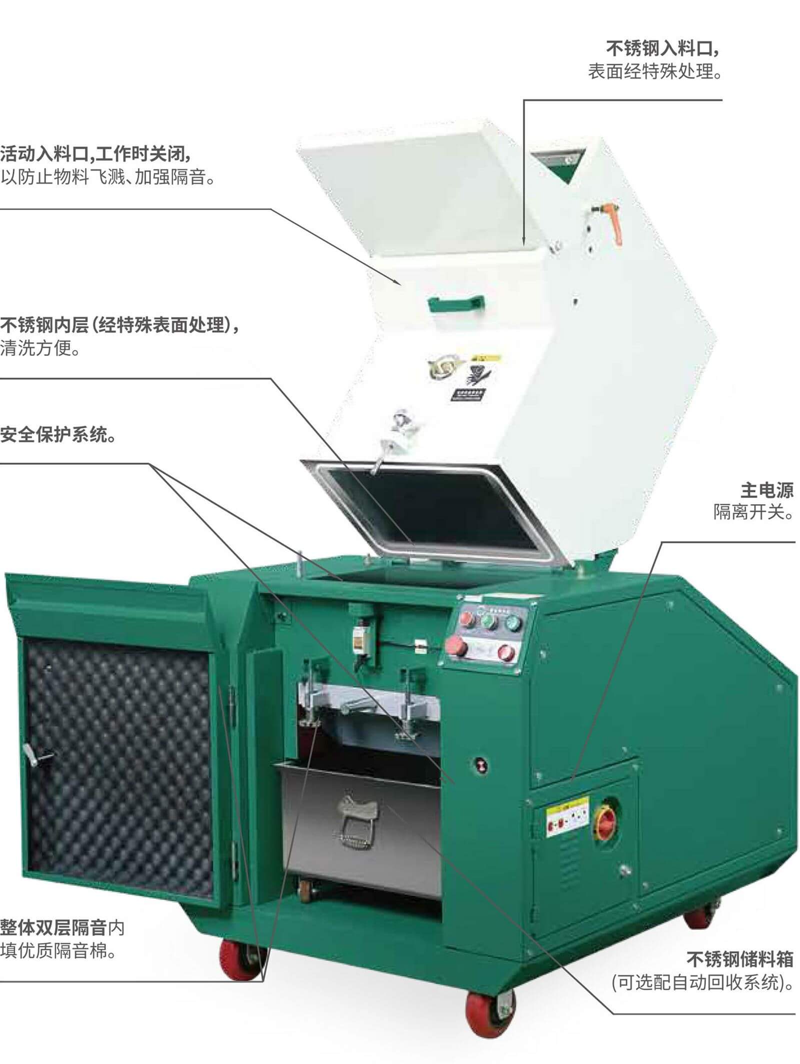 性能特点全封闭静音设计,机台周围1米范围外噪音在80dB以下,同时避免了粉尘污染。独特设计内部导热系统,在保持全封闭的前提下,将电机所产生的热量排出机外,延长电机使用寿命。内设安全保护系统,可选配CE认证电器,完全符合欧洲安全标准。配有相序控制器,可防止因电机反转所造成的不良后果。装有电源隔离开关,维修、操作更加方便、安全。活动不锈钢进料口、手柄开关等人性化设计,使得操作时得心应手、轻松自如。不锈钢接料车清洗方便,也可选配吸料机吸料斗或回收中心。